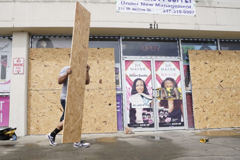 Majiteľ prevádzky sa snaží ochrániť svoj obchod pred hurikánom Ida. Foto: SITA/AP.