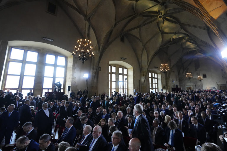 Významní predstavitelia čakajú na inauguračný ceremoniál novozvoleného českého prezidenta Petra Pavla na Pražskom hrade v Prahe vo štvrtok 9. marca 2023. Foto: SITA/AP, Petr David Josek