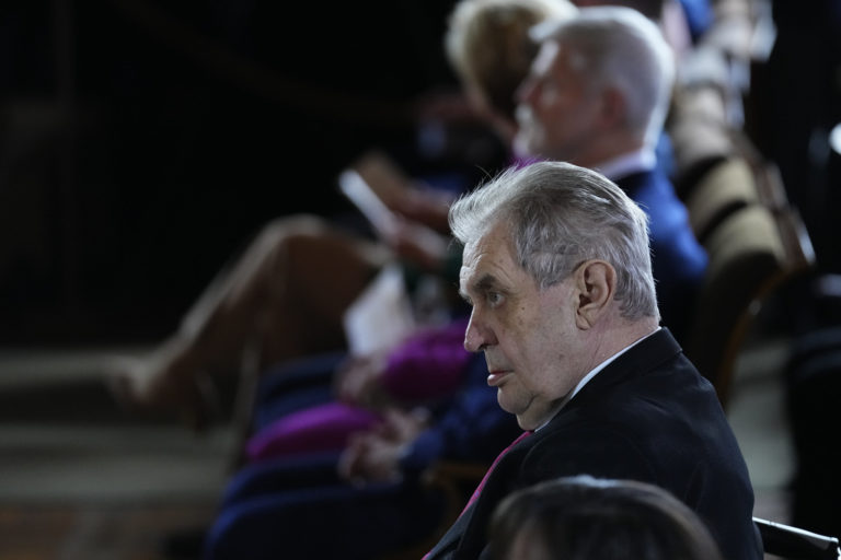 Bývalý prezident Miloš Zeman sa vo štvrtok 9. marca 2023 zúčastňuje inaugurácie novozvoleného českého prezidenta Petra Pavla na Pražskom hrade. Foto: SITA/AP, Petr David Josek