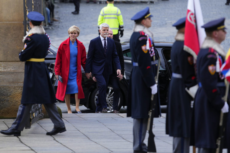 Zvolený prezident Českej republiky Petr Pavel je v sprievode svojej manželky Evy na Pražskom hrade na svojej inauguračnej slávnosti. Foto: SITA/AP, Petr David Josek