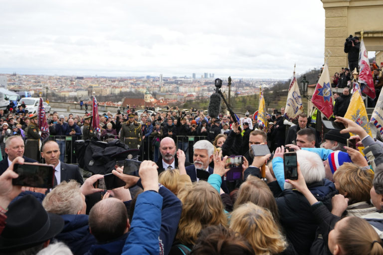 Novozvolený český prezident Petr Pavel je po svojej inauguračnej ceremónii na Pražskom hrade vo štvrtok 9. marca 2023 obklopený davom. Foto: SITA/AP, Petr David Josek