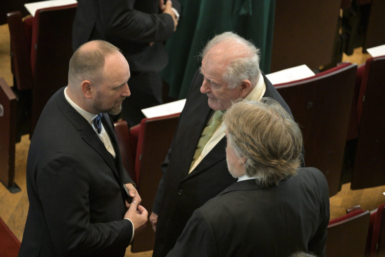 Sprava: Prezident SR Peter Pellegrini, predseda Ústavného súdu SR Ivan Fiačan a podpredseda Národnej rady SR Peter Žiga, poverený výkonom právomocí predsedu NR SR počas príhovoru prezidenta SR v rámci slávnostnej schôdze Národnej rady SR v budove Slovenskej filharmónie pri príležitosti inaugurácie novozvoleného prezidenta SR Petra Pellegriniho. Bratislava, 15. jún 2024. Foto: SITA/Milan Illík