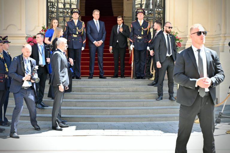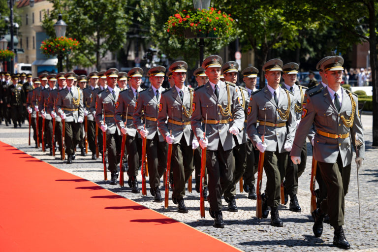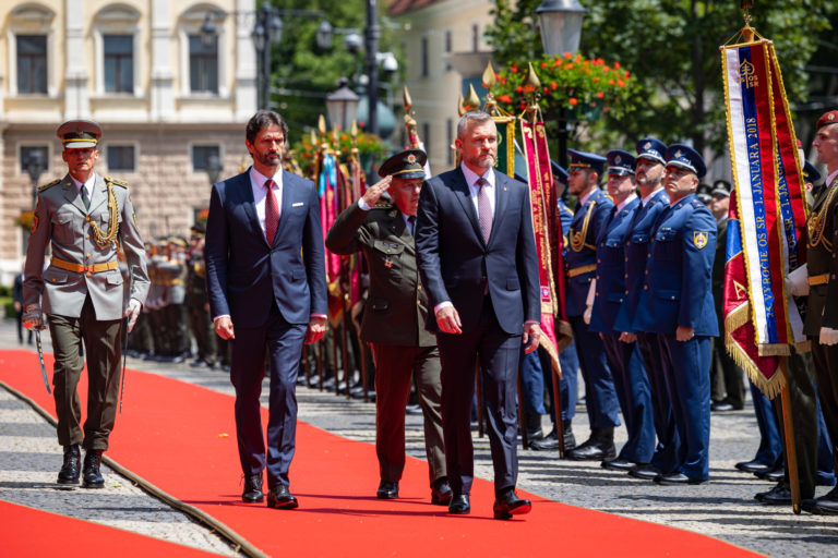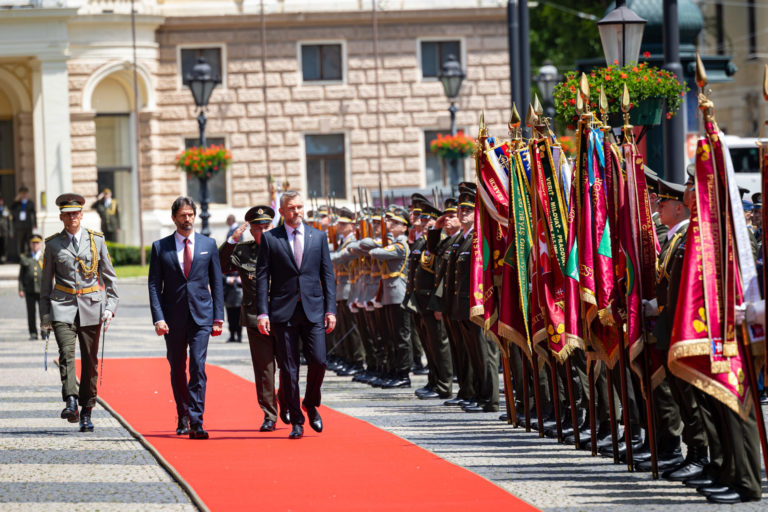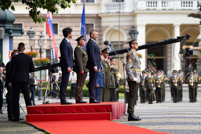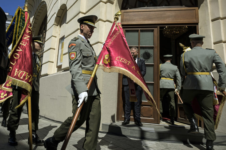 Čestná stráž prezidenta SR na prednom nádvorí Prezidentského paláca v rámci prevzatia Prezidentského paláca prezidentom SR pri príležitosti inaugurácie prezidenta SR Petra Pellegriniho. Bratislava, 15. jún 2024. Foto: SITA/Jakub Julény