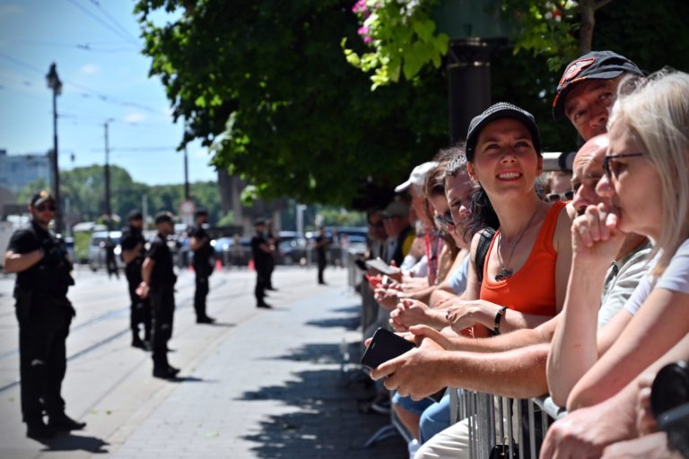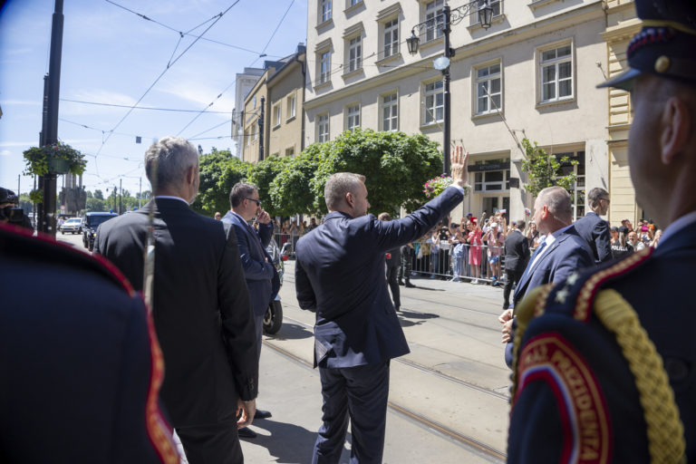 Atmosféra pred budovou Reduty počas príchodu ústavných činiteľov na slávnostnú schôdzu Národnej rady SR v budove Slovenskej filharmónie pri príležitosti inaugurácie novozvoleného prezidenta SR Petra Pellegriniho. Bratislava, 15. jún 2024. Foto: SITA/ Jakub Julény
