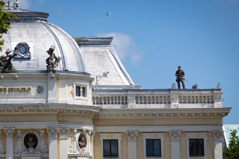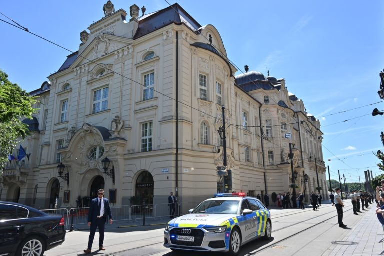 Atmosféra pred budovou Reduty počas príchodu ústavných činiteľov pred začatím slávnostnej schôdze Národnej rady SR v budove Slovenskej filharmónie pri príležitosti inaugurácie novozvoleného prezidenta SR Petra Pellegriniho. Bratislava, 15. jún 2024. Foto: SITA/Jakub Julény