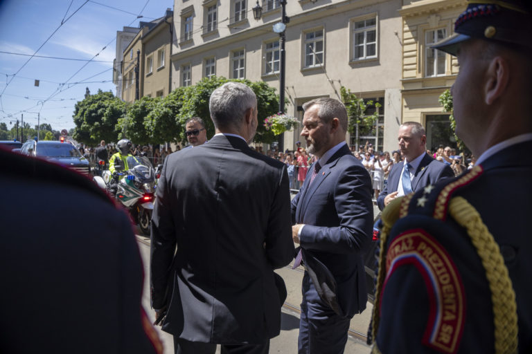 Novozvolený prezident SR Peter Pellegrini (uprostred vpravo) počas príchodu na slávnostnú schôdzu Národnej rady SR v budove Slovenskej filharmónie pri príležitosti inaugurácie novozvoleného prezidenta SR Petra Pellegriniho. Bratislava, 15. jún 2024. Foto: SITA/Kancelária Národnej rady SR