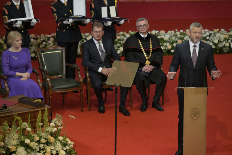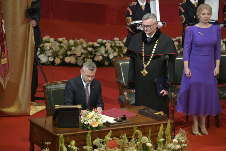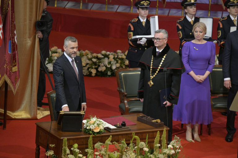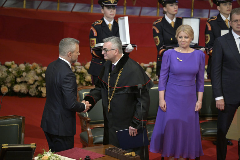 Zľava: Zvolený prezident SR Peter Pellegrini, predseda Ústavného súdu SR Ivan Fiačan a odchádzajúca prezidentka SR Zuzana Čaputová počas skladania sľubu predpísaného Ústavou SR zvoleným prezidentom SR v rámci slávnostnej schôdze Národnej rady SR v budove Slovenskej filharmónie pri príležitosti inaugurácie novozvoleného prezidenta SR Petra Pellegriniho. Bratislava, 15. jún 2024. Foto: SITA/Milan Illík