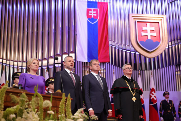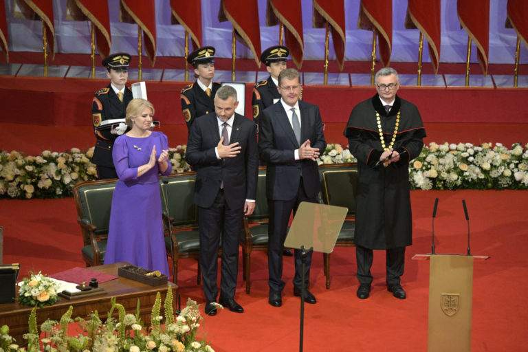 Sprava: Prezident SR Peter Pellegrini, predseda Ústavného súdu SR Ivan Fiačan, podpredseda Národnej rady SR Peter Žiga, poverený výkonom právomocí predsedu NR SR a bývalá prezidentka SR Zuzana Čaputová po zložení sľubu zvoleného prezidenta SR počas slávnostnej schôdze Národnej rady SR v budove Slovenskej filharmónie pri príležitosti inaugurácie novozvoleného prezidenta SR Petra Pellegriniho. Bratislava, 15. jún 2024. Foto: SITA/Milan Illík
