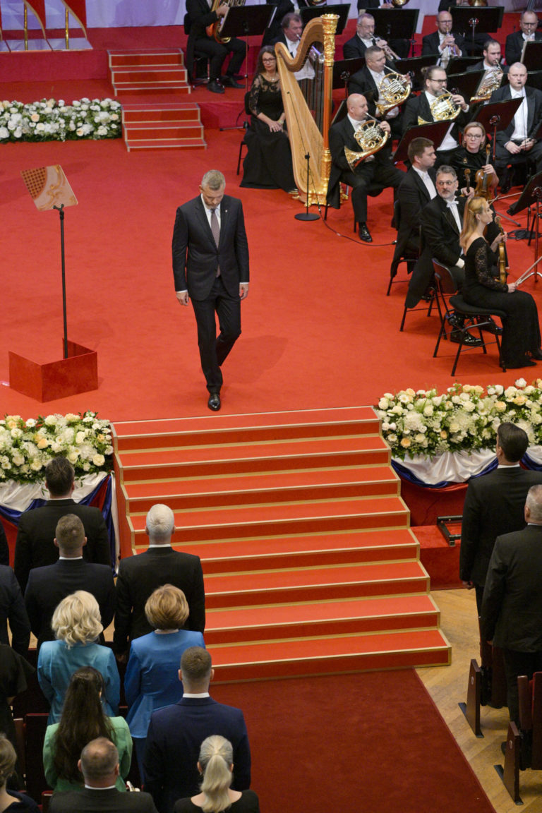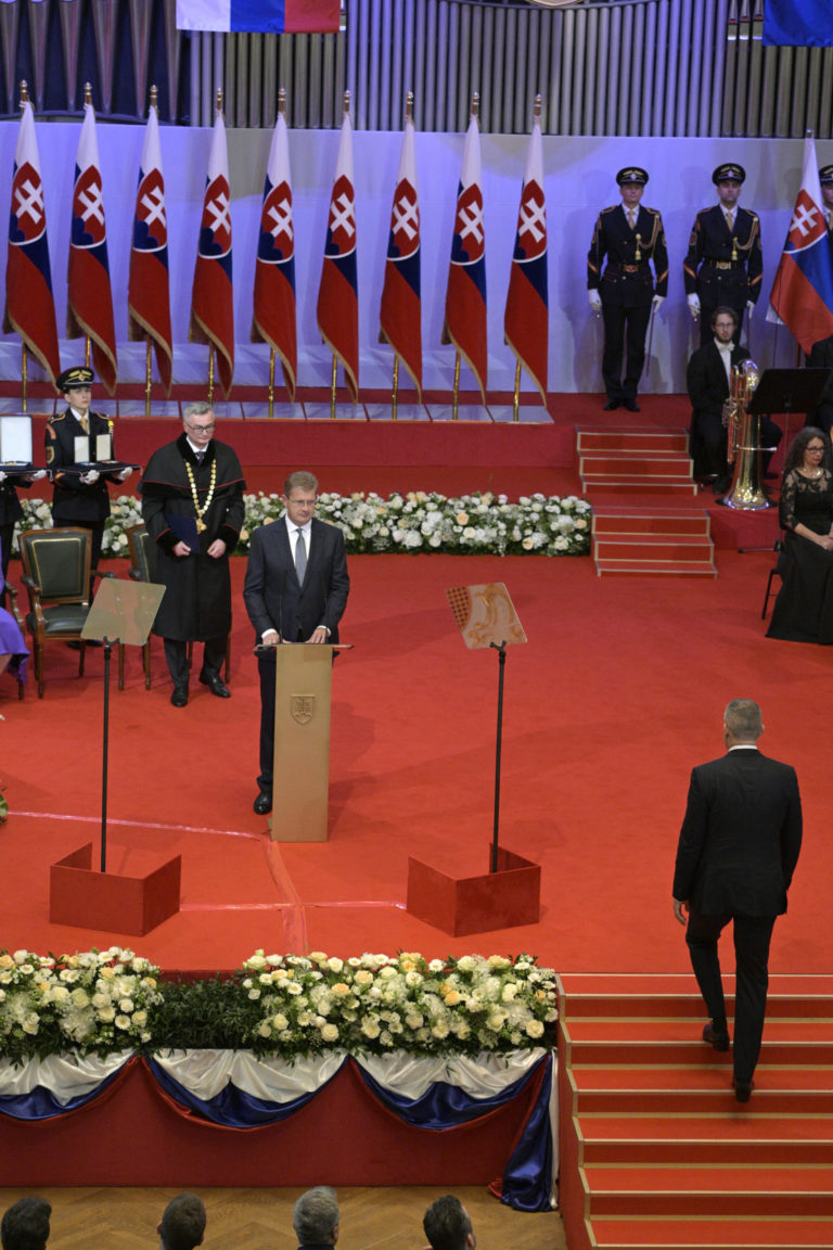 Prezident SR Peter Pellegrini (uprostred) odchádza po príhovore v rámci slávnostnej schôdze Národnej rady SR v budove Slovenskej filharmónie pri príležitosti inaugurácie novozvoleného prezidenta SR Petra Pellegriniho. Bratislava, 15. jún 2024. Foto: SITA/Milan Illík