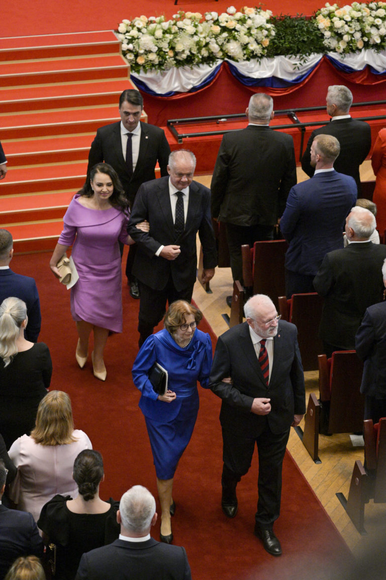 Uprostred zdola: Bývalý prezident SR Ivan Gašparovič s manželkou a bývalý prezident SR Andrej Kiska s manželkou po príhovore prezidenta SR v rámci slávnostnej schôdze Národnej rady SR v budove Slovenskej filharmónie pri príležitosti inaugurácie novozvoleného prezidenta SR Petra Pellegriniho. Bratislava, 15. jún 2024. Foto: SITA/Milan Illík