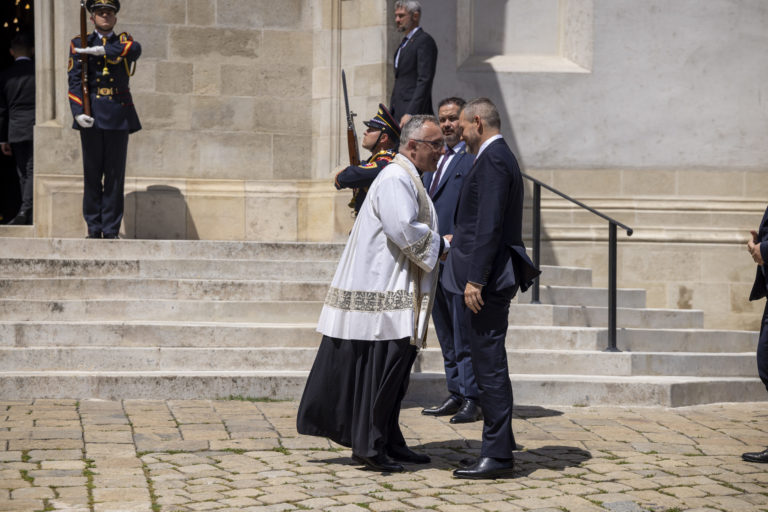 Zľava: Správca Farnosti svätého Martina Peter Slepčan a prezident SR Peter Pellegrini počas príchodu na slávnostnú bohoslužbu slova Te Deum do Dómu svätého Martina po zložení sľubu prezidenta SR v rámci inaugurácie nového prezidenta SR Petra Pellegriniho. Bratislava, 15. jún 2024. Foto: SITA/Kancelária NR SR