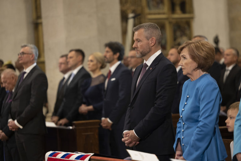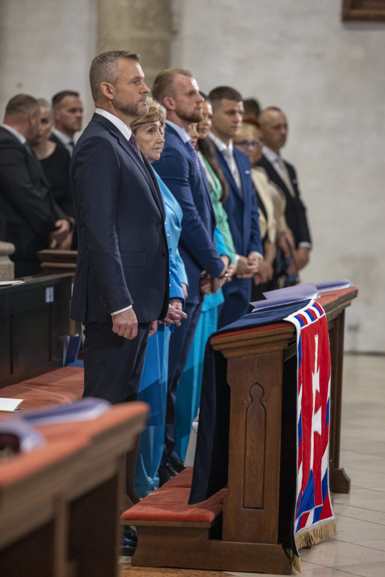 Prezident SR Peter Pellegrini (tretí sprava) počas slávnostnej bohoslužby slova Te Deum v Dóme svätého Martina po zložení sľubu prezidenta SR v rámci inaugurácie nového prezidenta SR Petra Pellegriniho. Bratislava, 15. jún 2024. Foto: SITA/Kancelária NR SR