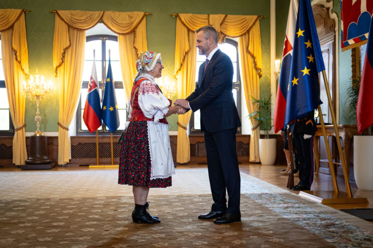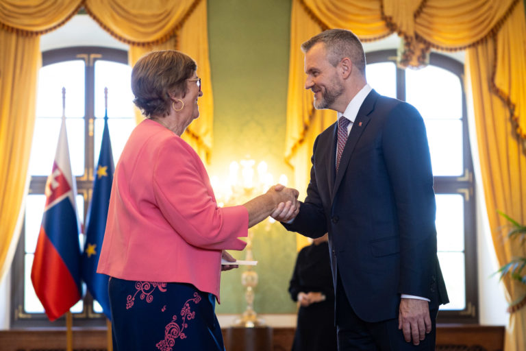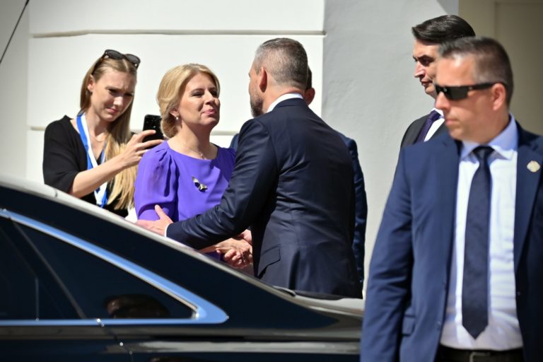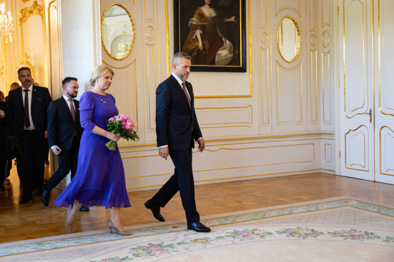 Zľava: Bývalá prezidentka SR Zuzana Čaputová a prezident SR Peter Pellegrini počas prevzatia Prezidentského paláca pri príležitosti inaugurácie prezidenta SR Petra Pellegriniho. Bratislava, 15. jún 2024. Foto: SITA/Jana Birošová
