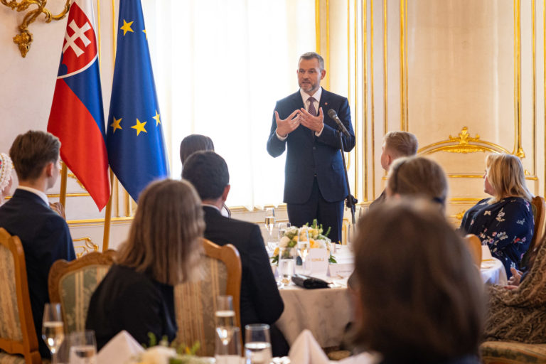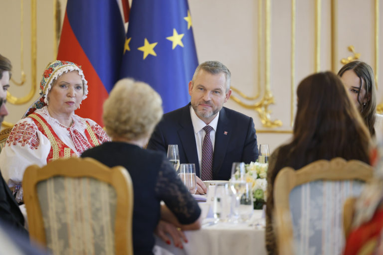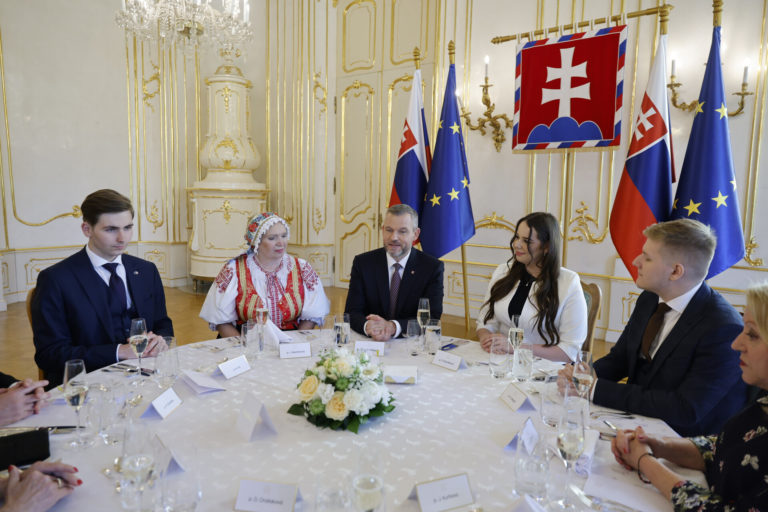 Prezident SR Peter Pellegrini (uprostred) počas slávnostného obeda na pozvanie prezidenta SR v Prezidentskom paláci pri príležitosti inaugurácie prezidenta SR Petra Pellegriniho. Bratislava, 15. jún 2024. Foto: SITA/Jana Birošová