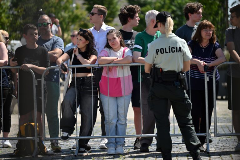 Návštevníci na Hodžovom námestí počas prehliadky Čestnej stráže prezidenta SR na prednom nádvorí Prezidentského paláca v rámci prevzatia Prezidentského paláca prezidentom SR pri príležitosti inaugurácie prezidenta SR Petra Pellegriniho. Bratislava, 15. jún 2024. Foto: SITA/Jakub Julény