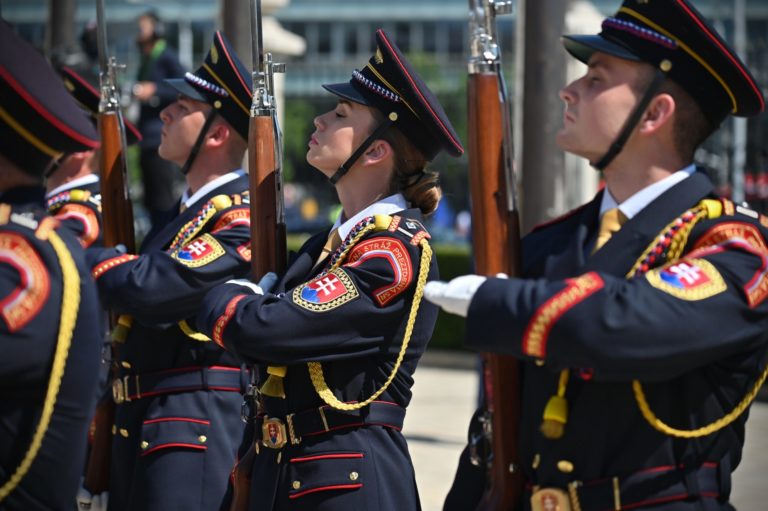 Čestná stráž počas prehliadky jednotiek Ozbrojených síl Slovenskej republiky na Hviezdoslavovom námestí pri príležitosti inaugurácie prezidenta SR Petra Pellegriniho. Bratislava, 15. jún 2024. Foto: SITA/Jana Birošová