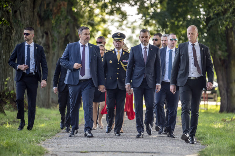 Prezident SR Peter Pellegrini (vpravo v popredí) počas pietneho aktu kladenia venca k pamätníku Brána slobody pri príležitosti inaugurácie prezidenta SR Petra Pellegriniho. Bratislava, 15. jún 2024. Foto: SITA/Jana Birošová