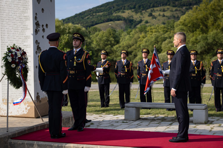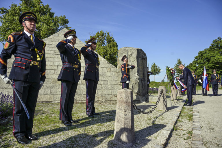 Prezident SR Peter Pellegrini (v popredí druhý sprava) počas pietneho aktu kladenia venca k Pamätníku M. R. Štefánika v Ivanke pri Dunaji. Ivanka pri Dunaji, 15. jún 2024. Foto: SITA/Milan Illík