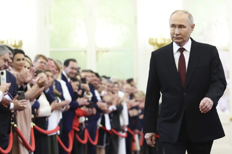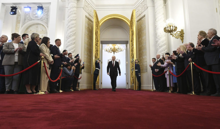 Vladimir Putin kráča zložiť prísahu ako ruský prezident počas inauguračného ceremoniálu vo Veľkom kremeľskom paláci v Moskve, Rusko, v utorok 7. mája 2024. Foto: Maxim Shemetov/Pool Photo via AP