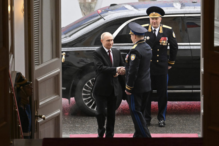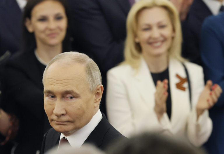 Vladimir Putin prichádza na slávnostnú inauguráciu do funkcie ruského prezidenta vo Veľkom kremeľskom paláci v Moskve v utorok 7. mája 2024. Foto: Sergey Savostyanov, Sputnik, Kremlin Pool Photo via AP