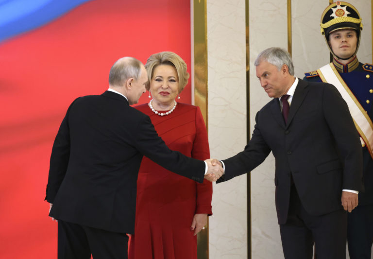 Vladimir Putin (vľavo) sa zdraví s predsedom ruskej Štátnej dumy Vjačeslavom Volodinom (vpravo) a predsedníčkou Rady federácie Valentinou Matvijenkovou pred inauguračným ceremoniálom vo Veľkom kremeľskom paláci v Moskve v utorok 7. mája 2024. Foto: Alexander Kazakov, Sputnik, Kremlin Pool Photo via AP