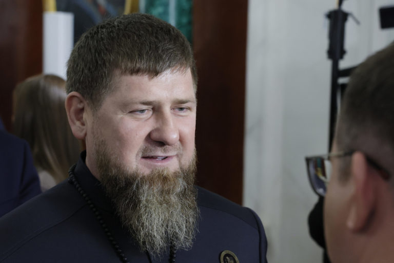 Hlava ruskej Čečenskej republiky Ramzan Kadyrov hovorí k médiám po slávnostnej inaugurácii Vladimíra Putina do funkcie ruského prezidenta vo Veľkom kremeľskom paláci v Moskve v utorok 7. mája 2024. Foto: Maxim Shemetov/Pool Photo via AP
