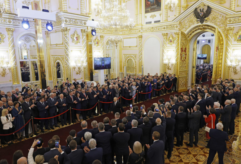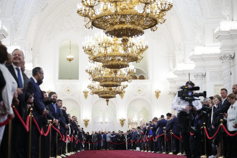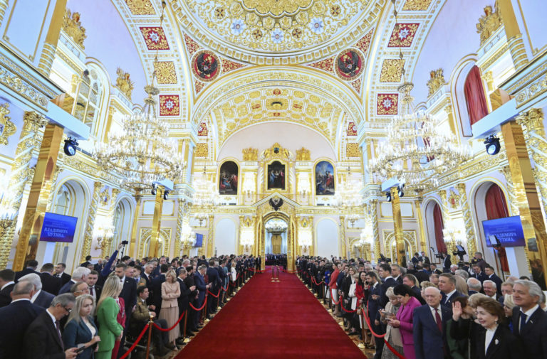 Hostia čakajú na príchod ruského prezidenta Vladimira Putina na slávnostnú inauguráciu do funkcie ruského prezidenta vo Veľkom kremeľskom paláci v Moskve v utorok 7. mája 2024. Foto: Grigory Sysoyev, Sputnik, Kremlin Pool Photo via AP