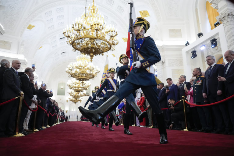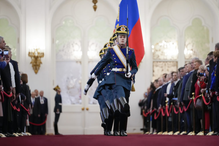 Vojaci čestnej stráže sa zúčastňujú na slávnostnej inaugurácii Vladimíra Putina do funkcie ruského prezidenta vo Veľkom kremeľskom paláci v Moskve v utorok 7. mája 2024. Foto: SITA/AP