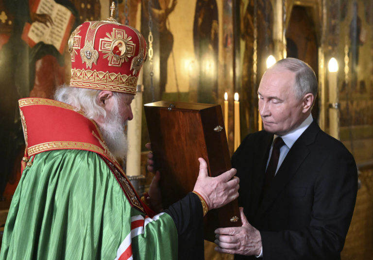 Ruský prezident Vladimir Putin (vpravo) a patriarcha moskovský a celej Rusi Kirill sa zúčastňujú na modlitbe po inauguračnom obrade v Chráme Zvestovania v Kremli v Moskve v utorok 7. mája 2024. Foto: Alexey Maishev, Sputnik, Kremlin Pool Photo via AP