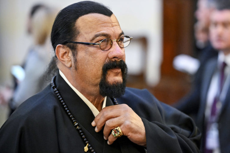 Americký herec z akčných filmov Steven Seagal prichádza na slávnostnú inauguráciu Vladimira Putina za ruského prezidenta vo Veľkom kremeľskom paláci v Moskve v utorok 7. mája 2024. Foto: Alexander Nemenov/Pool Photo via AP