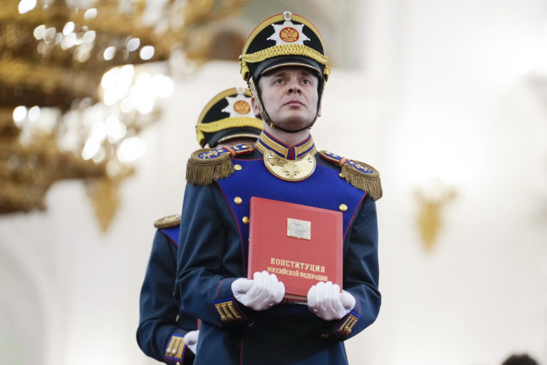 Vojak čestnej stráže nesie ruskú ústavu počas slávnostnej inaugurácie Vladimíra Putina do funkcie ruského prezidenta vo Veľkom kremeľskom paláci v Moskve v utorok 7. mája 2024. Foto: SITA/AP