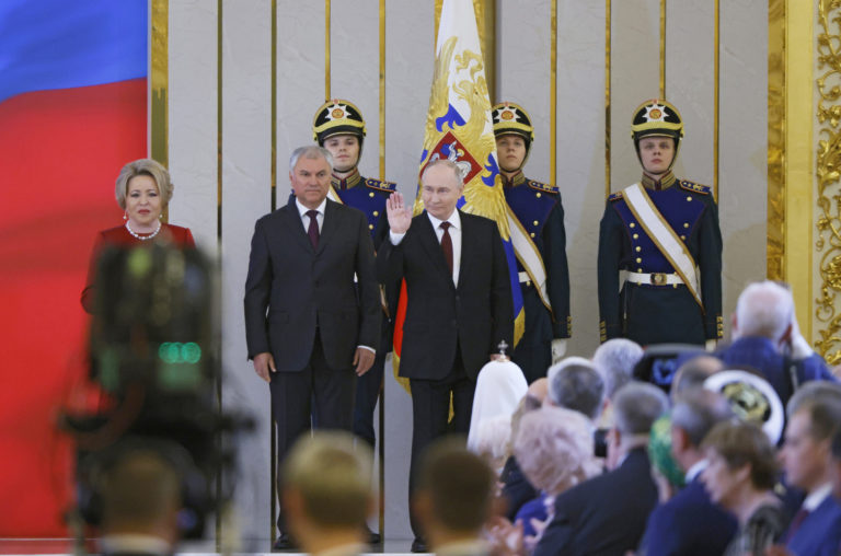 Vladimir Putin máva počas slávnostnej inaugurácie do funkcie ruského prezidenta vo Veľkom kremeľskom paláci v Moskve v utorok 7. mája 2024. Foto: Maxim Shemetov/Pool Photo via AP
