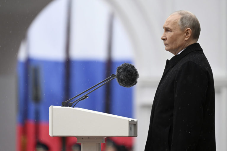 Ruský prezident Vladimir Putin si prezerá čestnú stráž prezidentského pluku po slávnostnej inaugurácii v Kremli v Moskve v utorok 7. mája 2024. Foto: Pavel Bednyakov, Sputnik, Kremlin Pool Photo via AP