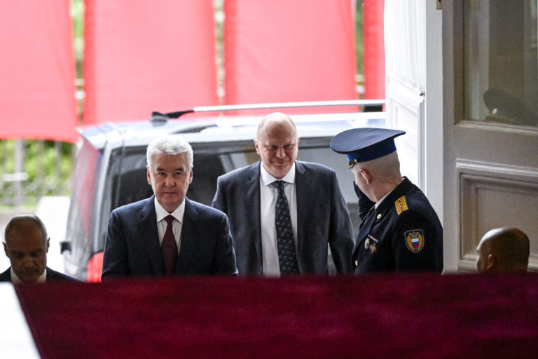 Starosta Moskvy Sergej Sobjanin (druhý zľava) prichádza na slávnostnú inauguráciu Vladimira Putina do funkcie ruského prezidenta vo Veľkom kremeľskom paláci v Moskve v utorok 7. mája 2024. Foto: Alexander Nemenov/Pool Photo via AP