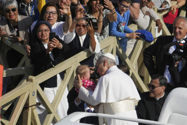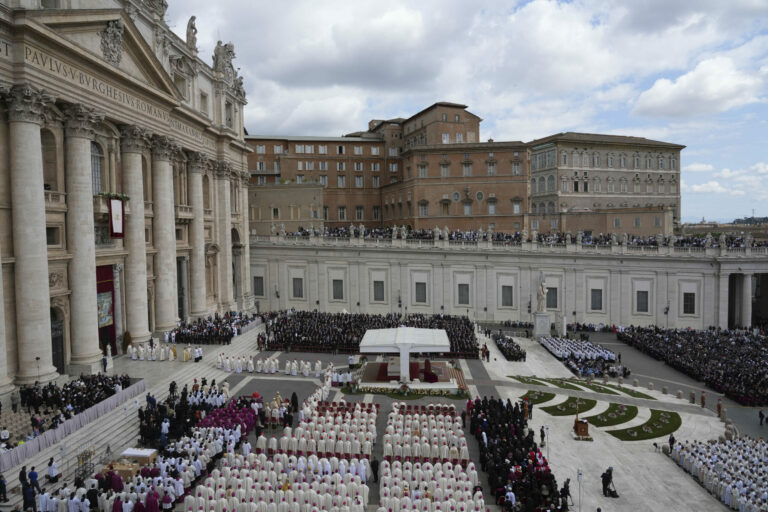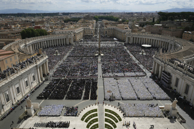 Ľudia sa zhromažďujú, keď pápež Lev XIV. slávi omšu pri oficiálnej inaugurácii svojho pontifikátu na Námestí svätého Petra vo Vatikáne v nedeľu 18. mája 2025. Foto: SITA – AP