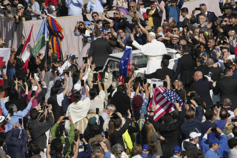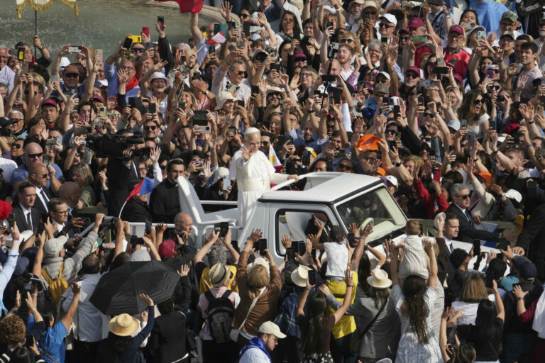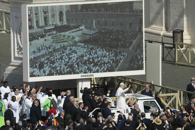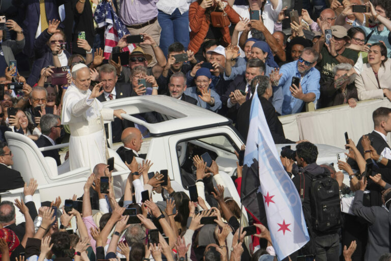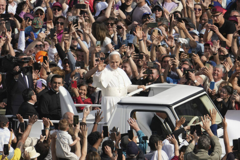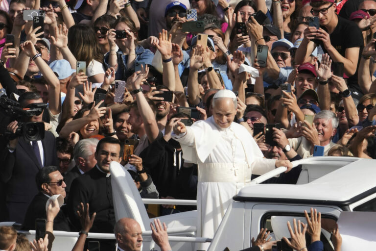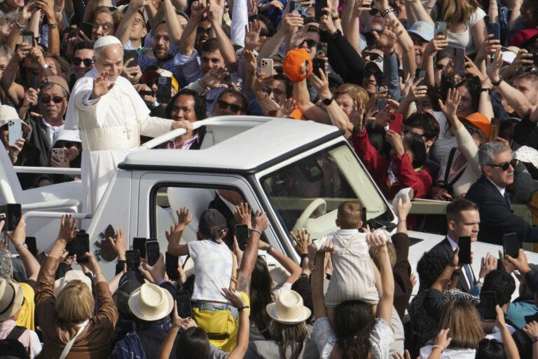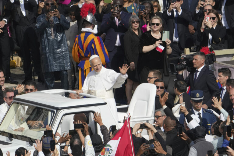 Pápež Lev XIV. prechádza na papamobile po Námestí svätého Petra vo Vatikáne pred inauguračnou omšou svojho pontifikátu v nedeľu 18. mája 2025. Foto: SITA – AP