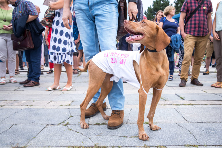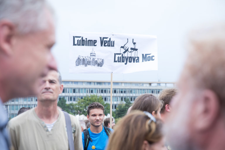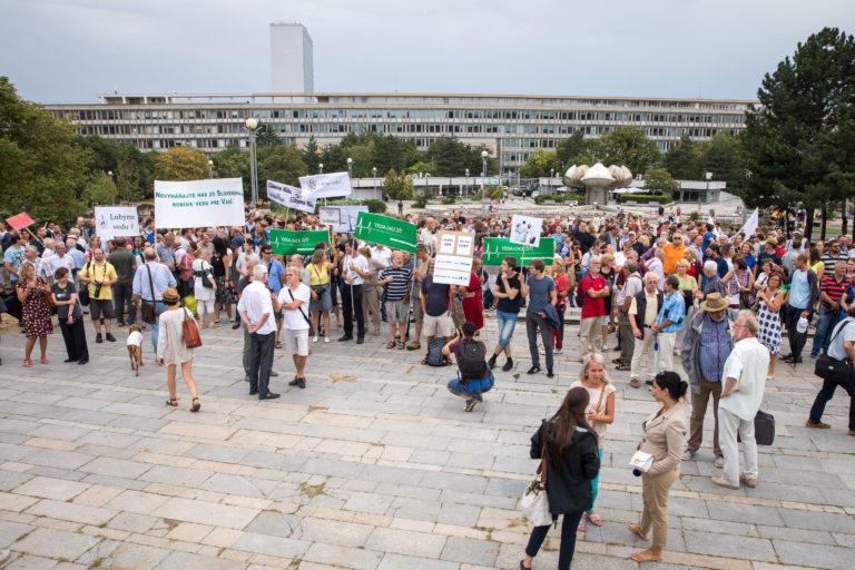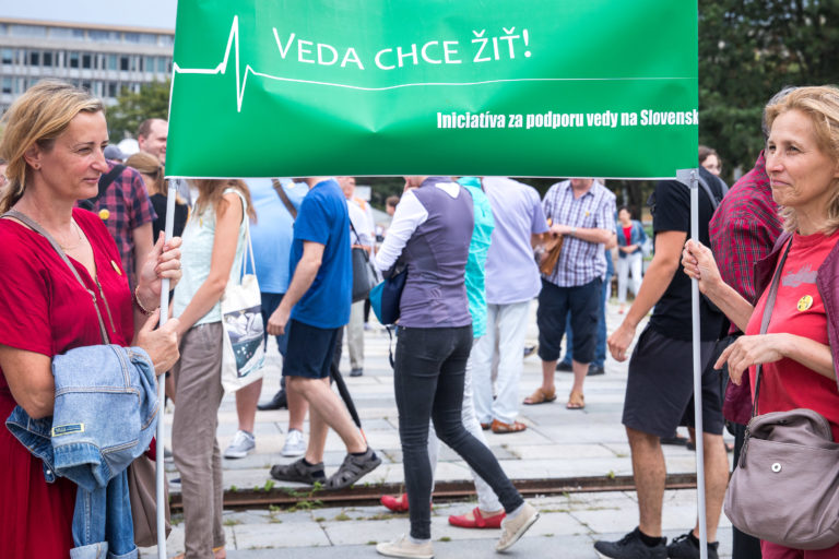 Iniciatíva Veda chce žiť! a Mladí vedci SAV počas protestného zhromaždenia na bratislavskom Námestí slobody, apelujú na štátne orgány, aby ukončili stav právnej neistoty a nastolili zákonnosť. Ministerstvo školstva, vedy výskumu a športu SR nesplnilo požiadavku predošlého protestu a nezapísalo organizácie SAV do registra verejných výskumných inštitúcií. Bratislava, 14. august 2018. Foto: SITA/Diana Černáková