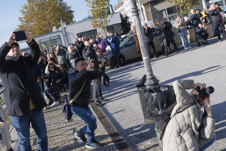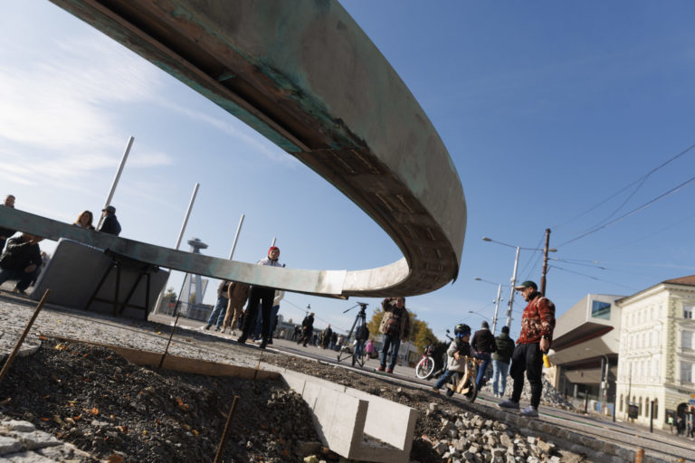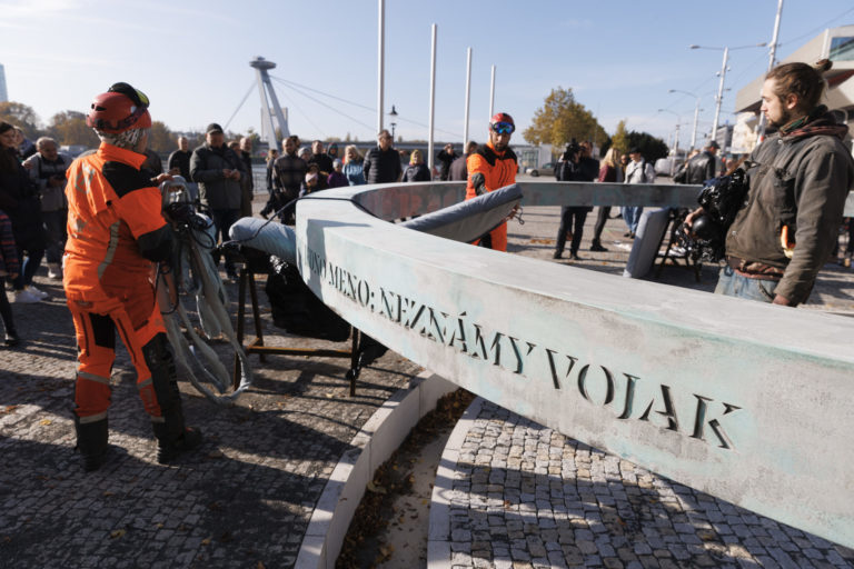 Atmosféra počas leteckého transportu a inštalácie nadrozmerného umeleckého diela k protokolárnemu miestu SR, Hrobu neznámeho vojaka na Rázusovom nábreží v Bratislave. Bratislava, 6. november 2022. Foto: SITA/Branislav Bibel
