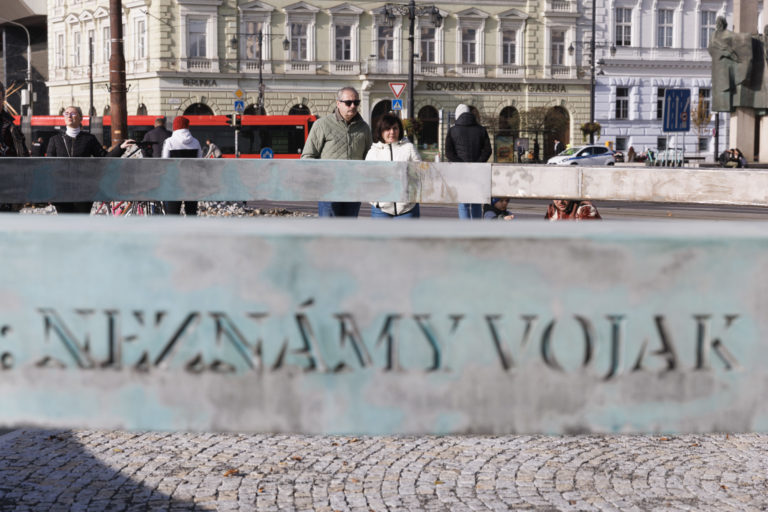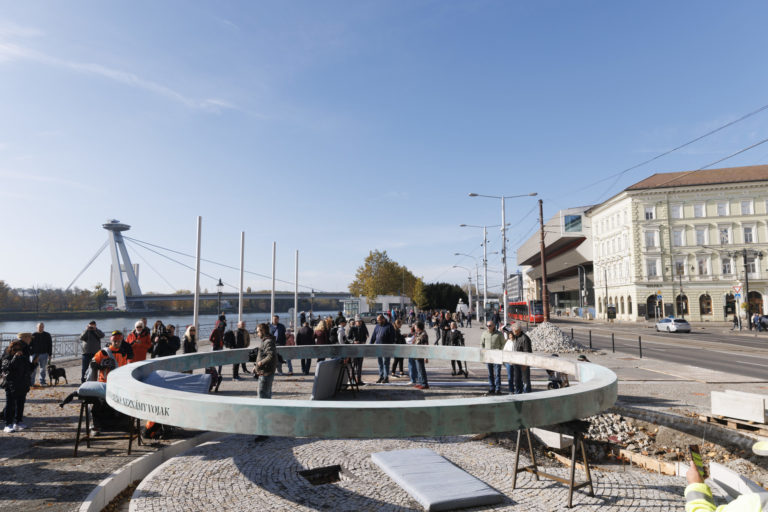 Účastníci si prehliadajú dielo počas inštalácie nadrozmerného umeleckého diela k protokolárnemu miestu SR, Hrobu neznámeho vojaka na Rázusovom nábreží v Bratislave. Bratislava, 6. november 2022. Foto: SITA/Branislav Bibel