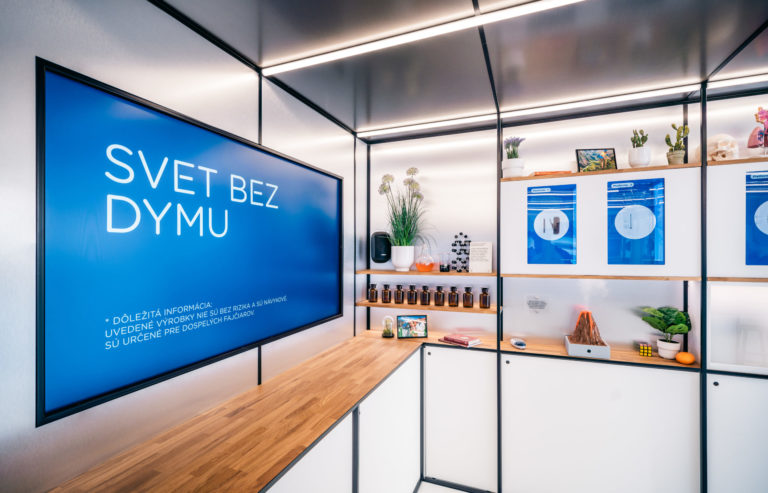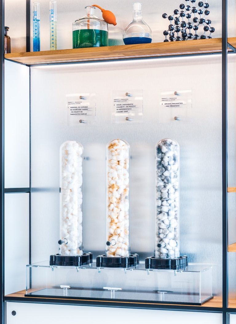 V laboratóriu môžete vidieť niekoľko názorných ukážok, napríklad porovnanie aerosolu z bezdymového zariadenia a dymu z klasickej cigarety. Foto: Philip Morris