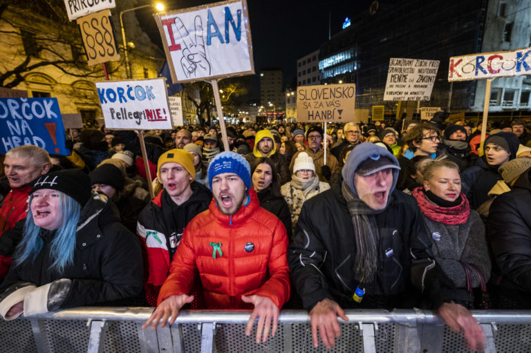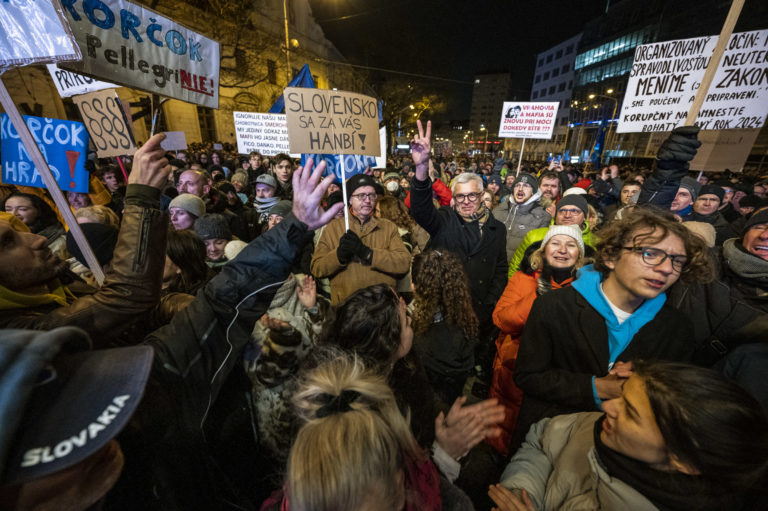 Kandidát na prezidenta SR Ivan Korčok (uprostred) počas protestného zhromaždenia hnutia Progresívne Slovensko (PS), strany Sloboda a Solidarita (SaS) a Kredsťanskodemokraticého hnutia (KDH) proti návrhu Trestného zákona, ktorý obsahuje aj zrušenie Úradu špeciálnej prokuratúry. Bratislava 11. január 2024. Foto: SITA/Milan Illík