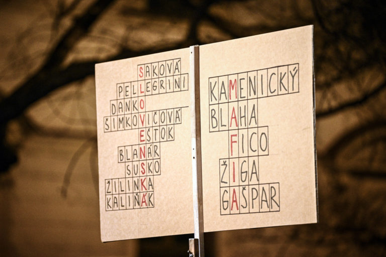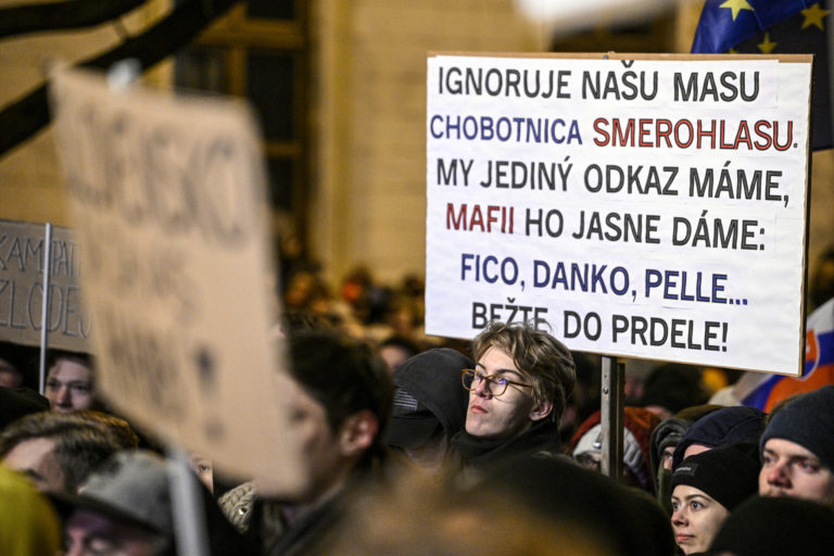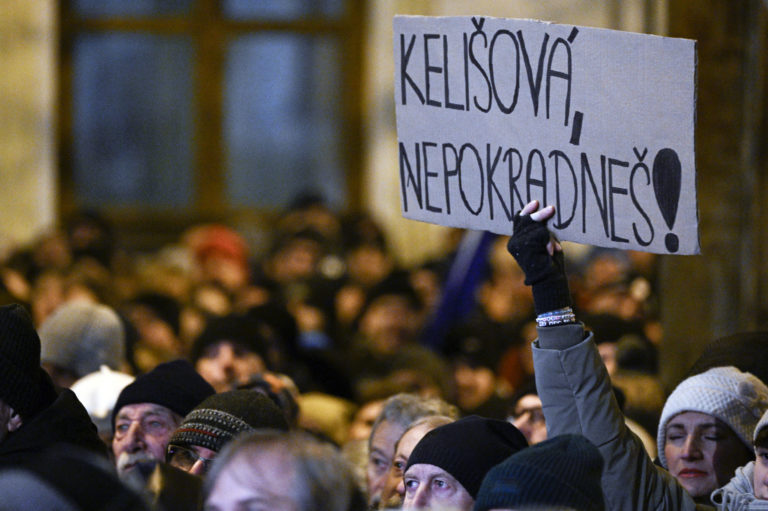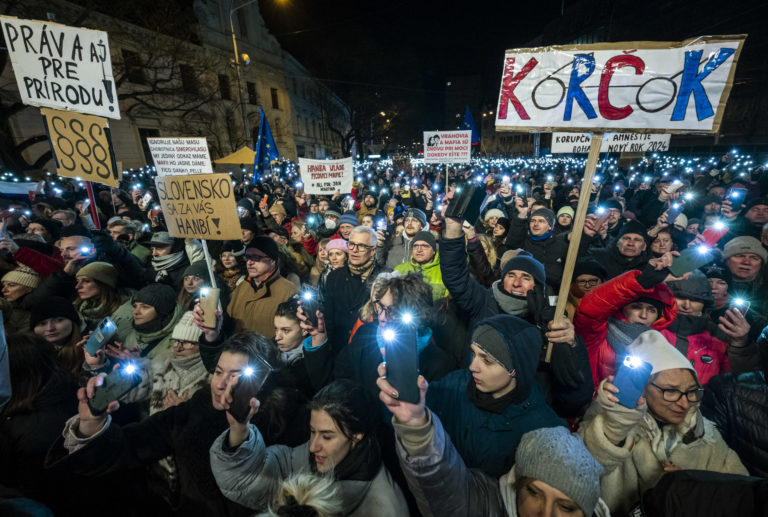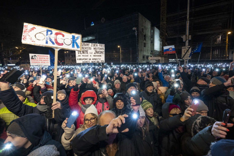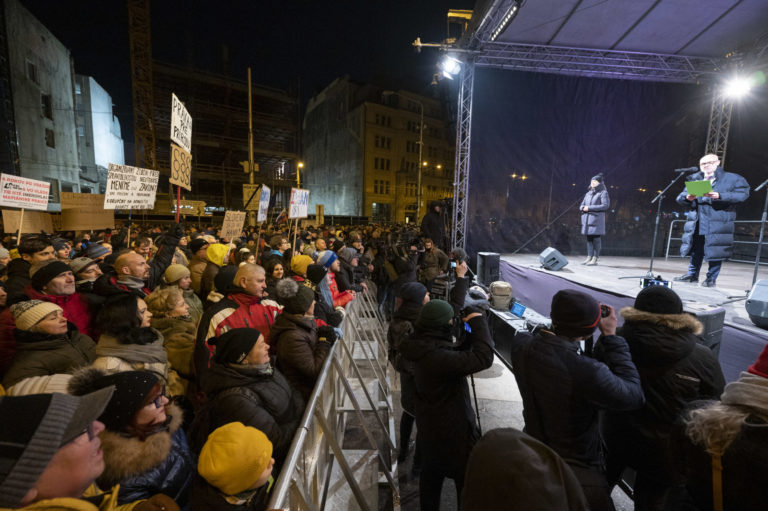 počas protestného zhromaždenia hnutia Progresívne Slovensko (PS), strany Sloboda a Solidarita (SaS) a Kredsťanskodemokraticého hnutia (KDH) proti návrhu Trestného zákona, ktorý obsahuje aj zrušenie Úradu špeciálnej prokuratúry. Bratislava 11. január 2024. Foto: SITA/Milan Illík