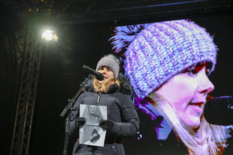 Manželka policajta Jarmila Koteková počas protestného zhromaždenia hnutia Progresívne Slovensko (PS), strany Sloboda a Solidarita (SaS) a Kredsťanskodemokraticého hnutia (KDH) proti návrhu Trestného zákona, ktorý obsahuje aj zrušenie Úradu špeciálnej prokuratúry. Bratislava 11. január 2024. Foto: SITA/Milan Illík