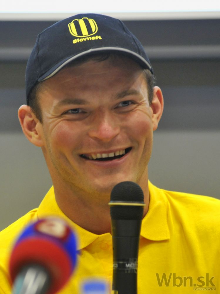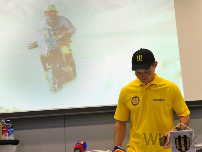 Jazdec motocyklového Slovnaft Teamu Štefan Svitko počas tlačovej besedy po návrate z Rely Dakar, kde obsadil vo svojej kategórii celkové piate miesto. Bratislava, 20. január 2015. Foto: SITA/Ján Slovák