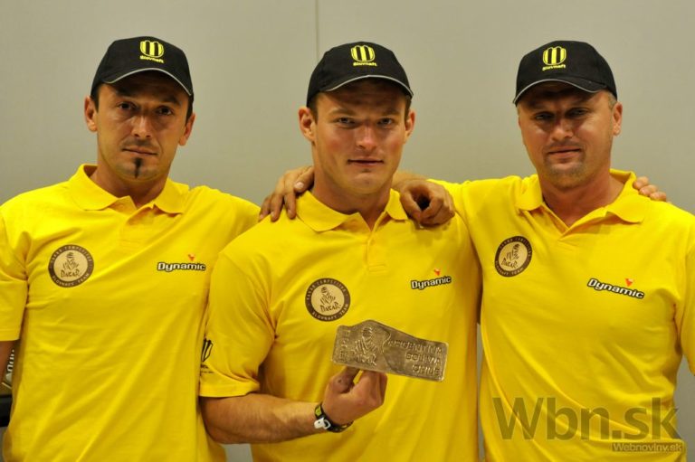 Sprava: Mechanik Zlatko Novosad, jazdec motocyklového Slovnaft Teamu Štefan Svitko a technický vedúci Martin Kubačka počas tlačovej besedy po návrate z Rely Dakar, kde obsadili vo svojej kategórii celkové piate miesto. Bratislava, 20. január 2015. Foto: SITA/Ján Slovák