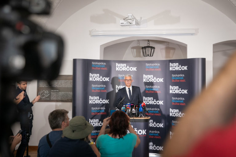 Bývalý minister zahraničných vecí SR a diplomat Ivan Korčok počas tlačovej konferencie v Banskej Bystrici, na ktorej oznámil, že bude kandidovať za prezidenta SR v budúcoročných prezidentských voľbách. Banská Bystrica, 30. august 2023. Foto: SITA/Jakub Julény