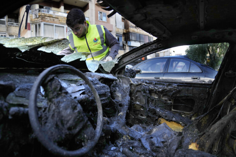 Pracovník civilnej obrany Hizballáhu hľadá telesné pozostatky v spálenom aute neďaleko obytného domu, kde utorkový izraelský útok zabil najvyššieho politického vodcu Hamasu Saleha Arouriho. Foto: SITA/AP