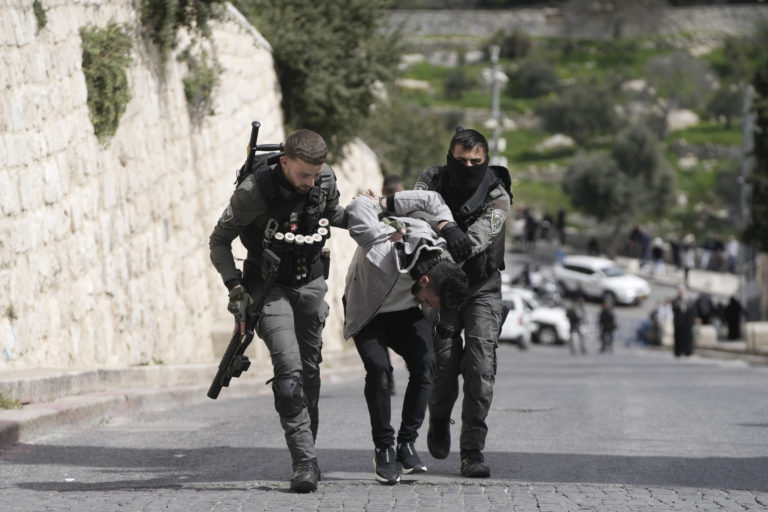 Izraelská pohraničná polícia zadržiava Palestínčana pred modlitbami v areáli mešity Al-Aksá. Foto: SITA/AP