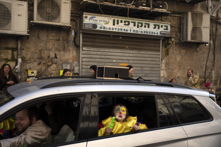 Židovské dieťa v kostýme sa pozerá z okna auta počas osláv židovského sviatku Purim. Foto: SITA/AP
