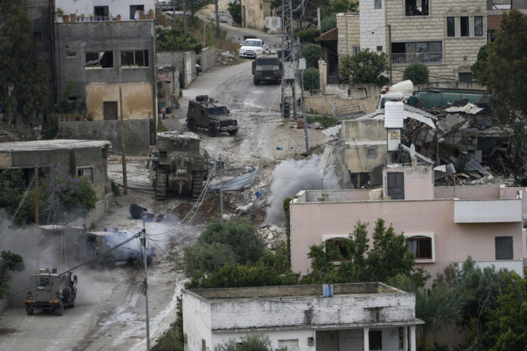 Dym stúpa po výbuchu počas izraelského vojenského zásahu v meste Deir al-Ghusun. Foto: SITA/AP